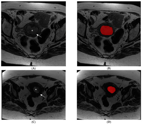 Examples of manual segmentation of endometrial tumors observed by MRI using an Axial Fast Spin Eco T2-weighted image acquisition sequence. (A,B) Images show an intermediate signal intensity lesion (asterisk) causing more than 50% myometrial invasion (arrow) in a patient with high-risk endometrial cancer before (A) and after (B) image segmentation. (C,D) Images show a patient with a low-risk endometrial tumor (asterisk) with less than 50% myometrial invasion (arrow) before (C) and after (D) image segmentation.