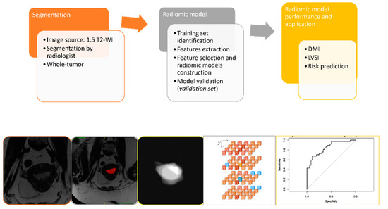 Endometrial cancer (EC) is the most common gynecological malignancy in industrialized countries and represents the sixth-most diagnosed cancer in women [2]. Conventionally, postoperative clinicopathologic findings such as tumor histology, stage of disease according to International Federation of Gynecology and Obstetrics (FIGO) [3], grade of histological differentiation, and lymphovascular space invasion (LVSI) are the key prognostic factors in EC. A risk classification including LVSI was proposed in 2016 [4]. Recently, the ESGO-ESTRO-ESP (European Society of Gynaecological Oncology—European Society for Radiotherapy & Oncology and European Society of Pathology) published updated guidelines for risk group determination in EC, integrating both clinicopathologic variables and molecular diagnostics [5], classifying patients into five risk classes (low risk, intermediate risk, high-intermediate risk, high risk, advanced/metastatic). Different surgical and adjuvant therapeutic strategies have been recommended for these different risk groups [5,6,7]. Therefore, the correct placing of EC within this prognostic stratification framework allows the most appropriate and individualized treatment. Magnetic resonance imaging (MRI) has a pivotal role in pretreatment assessment of EC, being highly specific in evaluation of deep myometrial invasion (DMI), cervical stromal involvement, and lymph node metastasis [8]. Recently, radiomic tumor profiling based on MRI has been proposed as a tool for accurate diagnosis, preoperative risk stratification, or assessment of treatment response in several cancer types, such as cervical cancers [9,10,11]. Despite promising performances of this field in clinical practice, only a few studies have explored MRI-based radiomic tumor features in endometrioid EC and linked these to an aggressive phenotype [12,13,14]. Thus, the aim of this study is to create and validate a radiomics model based on staging MRI in patients affected by EC for the prediction of DMI and LVSI, which to date represent the most relevant histopathological prognostic factors in decision-making on adjuvant therapy in early stages of EC. We also developed and validated a radiomics MRI-based model able to differentiate low-risk EC from the other ECs, as proposed by the ESGO/ESTRO/ESP evidence-based guidelines [5].