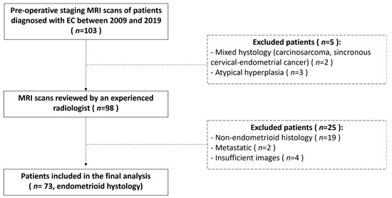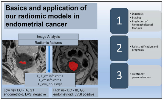 - Chen, J.; Gu, H.; Fan, W.; Wang, Y.; Chen, S.; Chen, X.; Wang, Z. MRI-Based Radiomic Model for Preoperative Risk stratification in Stage I Endometrial Cancer. J. Cancer 2021, 12, 726–734. [Google Scholar] [CrossRef] [PubMed]