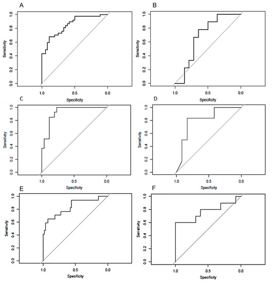 ROC curves of models to predict DMI on the training (A) and validation (B) sets, to predict LVSI on the training (C) and validation (D) sets, and to predict low-risk endometrial cancers on the training (E) and validation (F) sets.