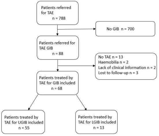 Several authors have studied the prognosis of patients treated with TAE for gastrointestinal bleeding. However, most of these studies have focused on LGIB or UGIB [], on a particular embolizing agent [], or a particular clinical situation [] or have had limited pre- or per-procedural clinical information [,]. Some studies include patients with arterial splanchnic bleeding without intraluminal bleeding []. There is a lack of a uniform reporting system because of the variety of definitions for clinical success. For example, the Society of Interventional Radiology defined clinical success as resolution of symptoms within 30 days after TAE, whereas other authors use 7 days after TAE as their time cut-off [,,]. Furthermore, studies do not systematically report the number of patients lost to follow-up [], nor do they report if these patients are excluded from the study or included in the final statistical analysis. We believe that the study of rebleeding and early mortality are the most appropriate to evaluate the effectiveness of TAE for GIB.