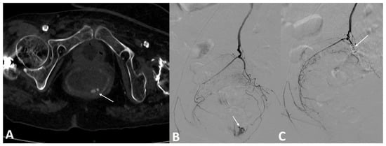 A 73-year-old patient on anticoagulation was referred for profuse rectal bleeding. Colonoscopy failed to stop the bleeding. (A) Axial section CT scan injected at arterial time confirming the active contrast extravasation in the rectal lumen. (B) Arteriography of the inferior mesenteric artery confirmed the presence of active bleeding from the left superior rectal artery. (C) Embolization with three fibered coils allowed a complete stop of the bleeding.