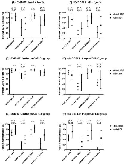 Figure 4 shows the word and sentence tests at a conversational speech level (65 dB SPL) and at a loud speech level (80 dB SPL) in quiet and noisy conditions with default and wide IIDR in all subjects separated by initial IIDR selection (preCSPL65 or preCSPL80). The results showed both significant differences between preCSPL65 and preCSPL80 in all test lists (p < 0.01) and a clear separation in these groups when evaluating words and sentences in noise at a conversational speech level (Figure 4A,B). From Figure 4B, most of the preCSPL80 scores in words and sentences in noisy conditions showed a severe drop to approximately 0% at a loud speech level. On the other hand, with a wide IIDR, there was no significant difference in all tests at a loud speech level.