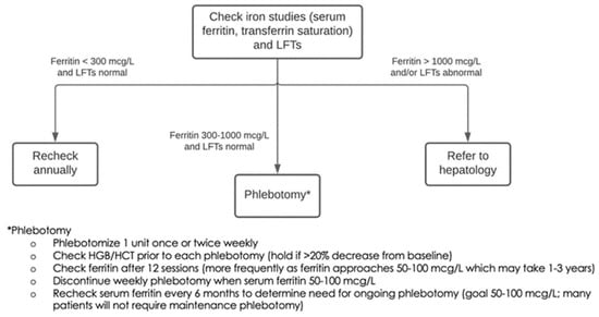 Diagram from our provider-facing information given to primary care providers for management of hereditary hemochromatosis.