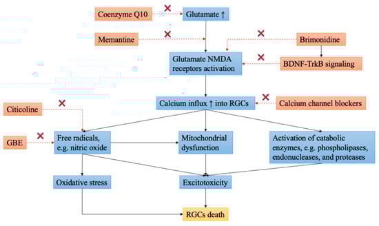 Neuroprotection is a therapeutic approach that aims at preserving neural structure and function [8]. In glaucoma, neuroprotection refers to non-IOP-related interventions that can prevent or delay the apoptosis of RGCs independent of IOP [9]. Although it may be difficult to identify a single causative factor for the development of glaucoma, a reasonable approach to tackling glaucomatous optic neuropathy remains targeting possible underlying mechanisms of glaucomatous damage, including the deprivation of neurotrophic factors (NTFs), the formation of reactive oxygen species (ROS), oxidative stress, glutamate excitotoxicity (Figure 2), ischemia, glial activation, and genetic determinants [10]. Therefore, understanding pathogenic factors in glaucoma may further pave the way to the development of more practical neuroprotective methods and subsequent clinical translation.
