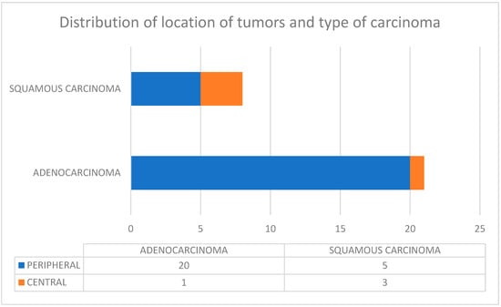 We assessed 29 patients with NSCLC. In 21/29 patients, the lesion was adenocarcinoma, while 8/29 patients had squamous carcinoma. Tumor lesions were localized in the peripheral area in 86.2% (25/29 patients), while 4/29 (13.8%) lesions were localized in the central area.
