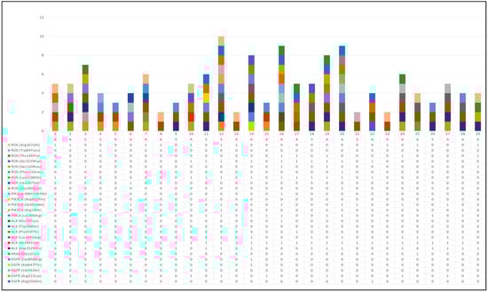 The mutations with the highest prevalence rate in the study populations were: ALK (Ile1461Val), found in 28/29 patients (96.6%), EML4 (Lys398Arg), identified in 16/29 (55.2%) patients, ALK (Asp1529Glu), found in 14/29 (48.3%) patients, EGFR (Arg521Lys), found in 12/29 (41.4%) patients, ROS (Lys2228Gln), identified in 11/29 (37.9%) patients, ROS (Arg167Gln) and ROS (Ser2229Cys), identified in 10/29 (34.5%) patients, ALK (Lys1491Arg) and PIK3CA (Ile391Met), identified in 8/29 (27.6%) patients, ROS (Thr145Pro), identified in 6/29 (20.7%) patients, and ROS (Ser1109Leu), identified in 4/29 (13.8%) patients. KRAS (Gly12Cys) was found in 2/29 (6.9%) patients, and EGFR (Arg255Gln), EGFR (Val592Ile), EGFR (Ala647Thr), EGFR (Leu858Arg), ALK (Pro254Thr), ALK (Trp288Ser), ALK (Glu797Lys), PIK3CA (Arg19Ile), PIK3CA (Arg852Pro), PIK3CA (Met1043Ile), ROS (Glu1902Lys), ROS (Leu567Val), ROS (Phe1153Leu), and ROS (Trp847Leu) were identified only in one patient.