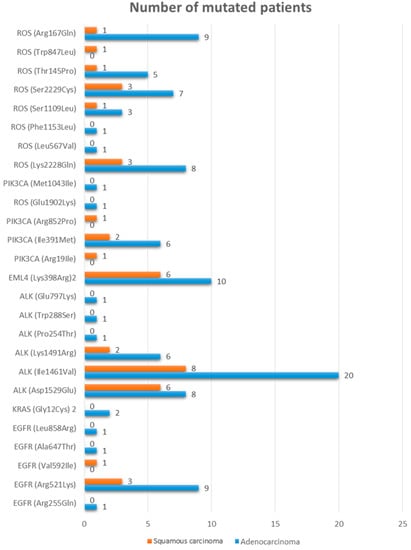 Figure 3 reports the number of mutated patients compared between the adenocarcinoma population and the squamous carcinoma population. No statistically significant differences were observed in the number of each mutation between the two populations (p > 0.05, Yates chi-square test, Table 3).
