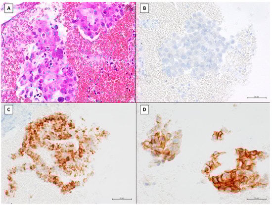(A) CB section of NSCLC adenocarcinoma (40× magnification, scale bar 50 µm, H/E staining). (B–D) Immunocytochemistry evaluation: (B) ALK-negative (Clone D5F3), (C) ROS1-positive (Clone SP384), and (D) PDL1-positive & gt; 50% (Clone SP263) (ICC assay on Ventana Benchmark XT, 40× magnification, scale bar 50 µm).