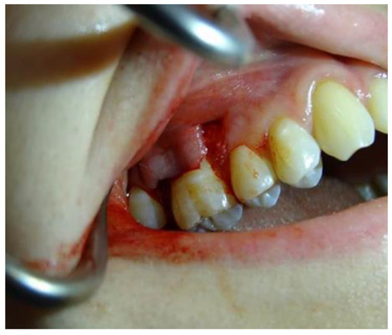 - Schmitt, C.M.; Moest, T.; Lutz, R.; Wehrhan, F.; Neukam, F.W.; Schlegel, K.A. Long-term outcomes after vestibuloplasty with a porcine collagen matrix (Mucograft®) versus the free gingival graft: A comparative prospective clinical trial. Clin. Oral Implant. Res. 2016, 27, e125–e133. [Google Scholar] [CrossRef]