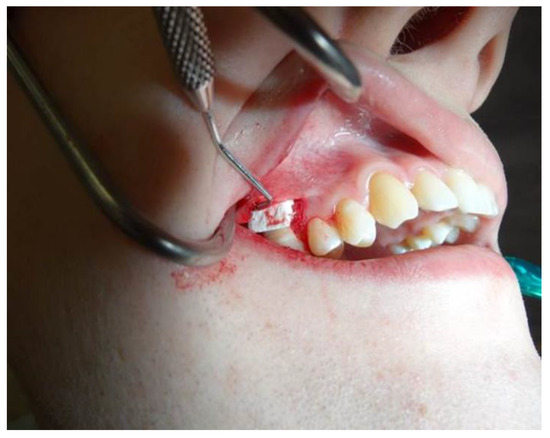The preparation of the flap size, which completely covers the matrix, is an essential stage of the procedure. Thanks to the three-dimensional structure, this matrix ensures the growth of tissue. However, for this process to occur, it must have contact with vascularized tissue on each side. Moistening the collagen matrix with blood already gives some stability, but according to the recommendation of producer, the material was fixed to the surface by resorbable sling sutures (6-0). While placing the suture pressure on the matrix was avoided, only the gentle assistance of the pliers was allowed. When the collagen matrix is soaked by blood, it is more prone to tear.