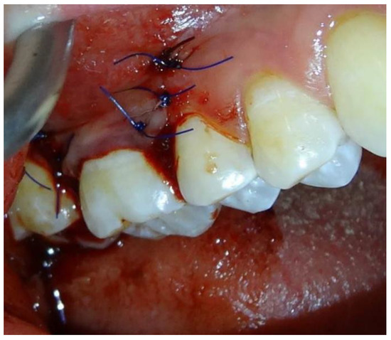 Subsequently, the exposed root and collagen matrix was covered with the coronally advanced flap and stabilized with single sutures (non-resorbable 6-0) and sling suture. No periodontal dressing was applied to the wound (Figure 3).