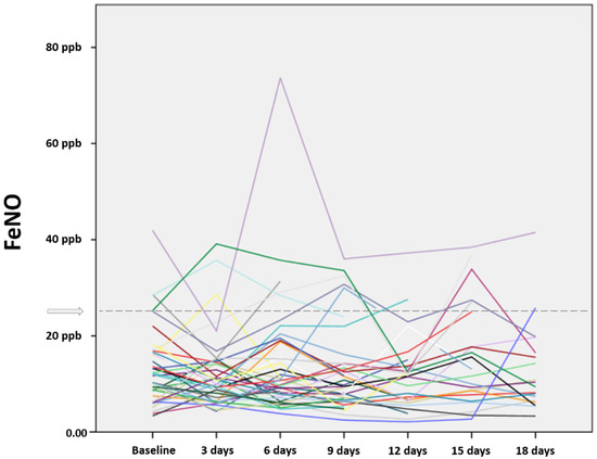 A trained operator measured FeNO in parts per billion (ppb) using an automated electrochemical instrument (HypAir FeNO®, Médisoft, Sorinnes, Belgium) following a standardized procedure which has been detailed elsewhere [36]. In brief, participants were studied in the sitting position, starting from total lung capacity and exhaling against a positive pressure to generate an exhalation flow rate of 50 mL/s, kept constant by means of a visual biofeedback on the display of the device. With high measurement consistency expressed by a linearity error of <0.5% reported by the manufacturer, HypAir FeNO® exhibited high precision and overall good compliance. Whenever applicable, FeNO was measured in all study participants at the baseline and at each time-point through serial sampling spaced 3 days apart (i.e., after 3, 6, 9, 12, 15, and 18 days). At the baseline, FeNO was assessed before post-bronchodilator functional spirometry. At different time-points, a single measurement was taken for each participant. If the first measurement failed, the entire procedure was repeated. A FeNO value of less than 25 ppb was considered normal/low [37].