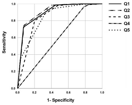 The results of the ROC curve analysis confirmed that the AUC values of Q1, Q2, Q3, and Q5 were greater than that of Q4.