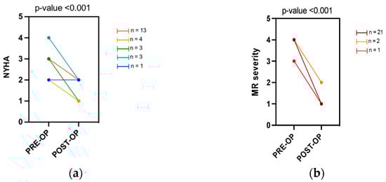 After TEER, there was a statically significant improvement in the NYHA class (median pre-NYHA class III vs median post-NYHA class II; p < 0.001). A positive procedural result in terms of reduction of the degree of MR was reached in all the subjects (Figure 1). No significant changes in the medical therapy were reported before and after the procedure. (Supplementary Table S1).