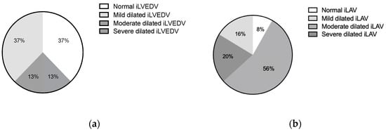 Grading of severity of left ventricular (a) and left atrial dilatation (b). Legend: iLVEDV, indexed left ventricular end-diastolic volume; iLAV, indexed left atrial volume.