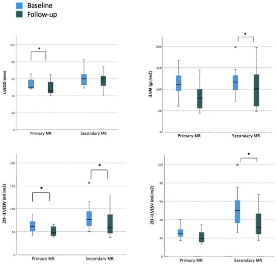 In the overall cohort, after a mean follow-up period of 5.7 ± 3.5 months, a statistically significant reduction was observed in left ventricular end-diastolic diameter (LVEDD) (baseline LVEDD 57.5 mm vs. post-procedural LVEDD 55.0 mm) but not in LVES diameter (LVESD). Similarly, indexed LVED and LVES volumes significantly improved (baseline 2D-iLVEDV 67.5 mL/m2 vs. post-procedural 2D-iLVEDV 53.5 mL/m2 and baseline 2D-iLVESV-2D 35.4 mL/m2 vs. post-procedural 2D-iLVESV 27.1 mL/m2, respectively). On the contrary, none of the parameters of LV systolic function showed a significant improvement during the follow-up period (baseline 2D-LVEF 48.8% vs. post-procedural 2D-LVEF 49.6%; baseline systolic velocity at the mitral annular (LV S’ TDI) 8.0 cm/s vs. post-procedural LV S’ TDI 8.0 cm/s) (Table 3). When considering the organic MR cohort, a reduction in LVEDD was still observed with consequently reduction in estimated LV indexed mass and a significant reduction in LVEDV was still reported. In this subset of patients with baseline preserved LVEF and normal LVESV, no significant improvement in terms of functional parameters was reported. When considering the functional subgroup, no significant reduction in LVEDD was reported; conversely, a significant reduction in LVEDV and LVESV was reported with a small although not significant improvement of the LVEF (Figure 3 and Supplementary Table S2).