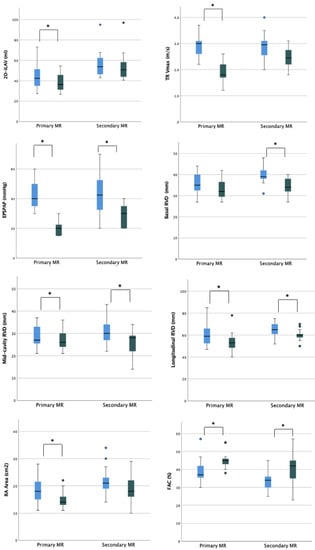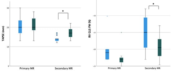 In our study, we reported the comparison between primary and secondary MR cohort in terms of right sections remodeling. As expected, we found a more significant impact in RV and RA reverse remodeling, better longitudinal function, and lower PAPs in patients with functional MR and severe RV involvement. Interestingly, patients with primary MR and less compromised RV function also showed an impact from afterload reduction provided by TEER, reflected into reduced cavity dimensions and ameliorated contractile performance. Moreover, systematic application of advanced echocardiography evaluations such as RV deformational imaging could help in identifying subclinical RV dysfunction, which can be reverted by TEER procedure.
