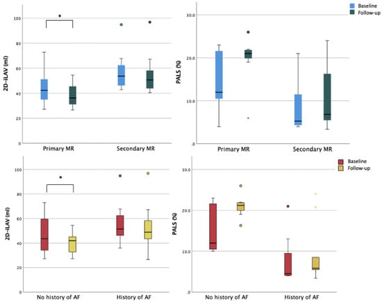 A statistically significant reduction in LA maximum volume was observed after TEER procedure (baseline 2D-iLAV 50.5 mL/m2 vs. post-procedural 2D-iLAV 44.1 mL/m2). Atrial function assessed by PALS improved during the follow-up period but without reaching statistical significance (baseline PALS 11% vs. post-procedural PALS 14.6%), see Table 3. These changes were reported in the organic subset of patients with mild LA dilation and LA reservoir function reduction at baseline. In the functional cohort, with more dilated atria and with a severely reduced reservoir function at the basal evaluation, no statistically significant reduction in LA volumes and a worsening LA reservoir function were observed at follow-up (Figure 3). When comparing patients with and without history of atrial fibrillation (AF), a significant reduction of LA volumetry was detected only in patients without anamnestic AF (Figure 4 and Table S3).