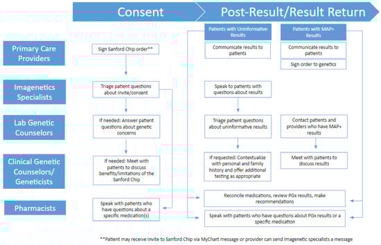 Sanford Health is the nation’s largest non-profit rural healthcare system with four hubs in Bemidji, MN; Bismarck, ND; Fargo ND; and Sioux Falls, SD. In 2013, Sanford Health provided 2.1 million clinic visits with 35 hospitals and 175 clinic locations. By 2020, Sanford Health provided 5.5 million clinic visits with 46 hospitals and 210 clinic locations. Given the global focus towards precision medicine [,], Sanford Health launched its “Imagenetics Initiative” precision medicine program in 2014 with a vision to expand the role of genetic testing in all aspects of medicine across the entire healthcare system []. Sanford Health expanded its electronic medical record (EMR) system to better accommodate genetic information, automating clinical decision support (CDS) to inform medication selections and integrating genomic indicators to provide tailored genetic information and health maintenance recommendations []. These capabilities are maintained by committees of pharmacists and genetic specialists to assure a best practice compliance. Initial work focused on developing pharmacogenetic (PGx) systems to support CYP2C19 genotyping to inform clopidogrel orders. Efforts culminated in 2018 with the launch of the “Sanford Chip” genetic screen (Supplemental Figure S1), a genetic test available system-wide to primary care patients that offers both a preemptive PGx testing and screening for monogenic medically actionable predispositions (MAPs) []. The Sanford Chip genetic screen, an array-based genotyping platform, was developed to identify PGx variants with existing use guidelines, per the Clinical Pharmacogenetic Implementation Consortium (CPIC). The PGx panel started with 8 genes, and has grown to 11 genes (CYP2C9, VKORC1, SLCO1B1, TPMT, DPYD, CY2C19, CYP3A5, CYP2D6, CYP4F2, CYP2C cluster, and IFNL3) for 51 medications based on the CPIC guideline updates. This genetic screen also identifies potential MAPs, variants in genes associated with conditions such as hereditary cancers and heart conditions referenced by the American College of Medical Genetics and Genomics (ACMG)s V2.0 list [] for the secondary findings’ disclosure. Details about the genetic screening platform, genes, and conditions examined have been published previously [].