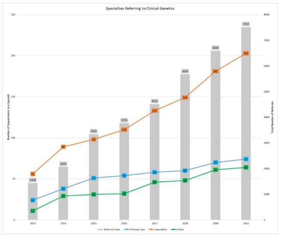 We used administrative records and EMR data to summarize the genetic referrals, uptake, and results of the precision medicine program. The data were summarized descriptively using Microsoft® Office Excel® 2016 (Version 16.0, Microsoft Corporation, Redmond, WA, USA). All active departments referring to a geneticist or genetic counselor from 01 January 2013 to 31 December 2020 were reviewed. Referrals made from pediatric departments were omitted from analyses because pediatric patients were not eligible for the precision medicine program. Referrals from genetic or laboratory departments were also omitted because these referrals reflected communication orders, such as referrals to the wrong department, rather than actual referrals. The departments that placed at least one referral order to a geneticist or genetic counselor were grouped into one of the following specialty areas: oncology, surgery, family medicine, internal medicine, obstetrics/gynecology, neurology, breast clinic, cardiology, endocrinology, otolaryngology (ENT), gastroenterology, nephrology, and other. The department specialty was determined by the name of the department. Some departments in rural areas with department names based on location rather than specialty were categorized as “other”.