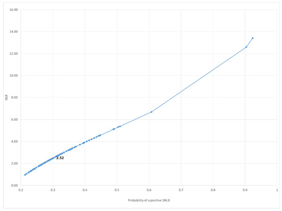 The mathematical relationship between the NLR and the probability of developing a positive SLNB was obtained with a logistic regression model using the equation in (2) which produced the following parameters: