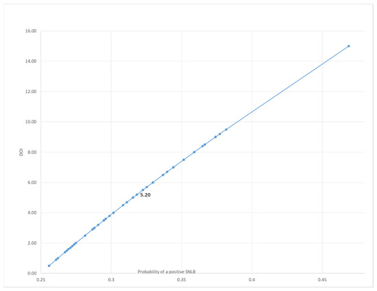 The mathematical relationship between the DOI and the probability of developing a positive SLNB was obtained with a logistic regression model using the equation in (3) which produced the following parameters: