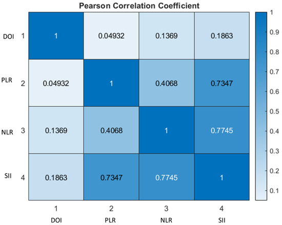 Heat map of the Pearson correlation coefficient between the DOI, PLR, NLR and SII.