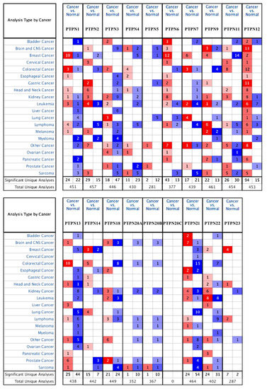 Transcription levels of protein tyrosine phosphatase non-receptor type (PTPN) family genes in different types of cancers. The thresholds of the p value and fold change were as follows: p = 0.01, fold change = 1.5, gene rank = 10%.