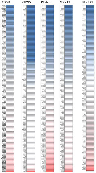 Gene expression levels of protein tyrosine phosphatase non-receptor type (PTPN) family members in lung cancer cell lines (from the CCLE database). The blue blocks indicate underexpression, whereas red blocks represent overexpression.