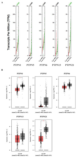 (A,B) Expressions of PTPN members in LUAD patients and normal tissue via the GEPIA 2 platform. The q-value cut-off was set to 0.01. The red star in the pictures indicates a significant difference between LUAD and normal tissues.