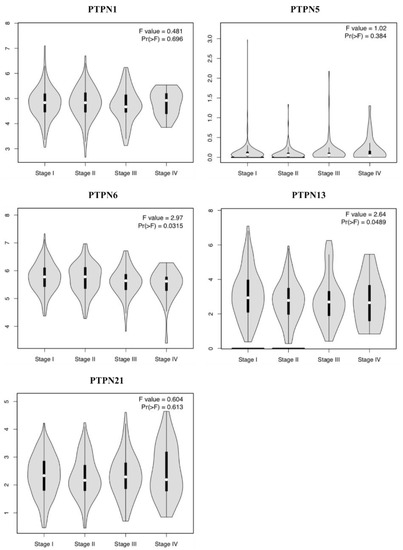 Furthermore, we compared transcriptional levels of PTPNs between LUAD and normal samples by interrogating the GEPIA dataset (Figure 4). We found that transcription levels of PTPN1 and PTPN21 in LUAD tissues were significantly lower than those in normal tissues, while transcription levels of PTPN5, PTPN6, and PTPN13 did not significantly differ between LUAD and normal tissues. Additionally, we also evaluated correlations between PTPN gene expression levels and the pathological stage of LUAD patients, and we discovered that expression levels of PTPN6 and PTPN13 were significantly correlated with the tumor stage of LUAD patients, while expression levels of PTPN1, PTPN5, and PTPN21 were not (Figure 5). According to the above results, it was confirmed that PTPN1, PTPN5, PTPN6, PTPN13, and PTPN21 were associated with the clinicopathological features of LUAD.