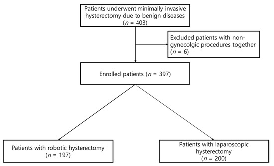 The inclusion criteria were (1) patients with a large uterus size over 250 g; (2) who underwent minimally invasive hysterectomy; and (3) who had benign diseases. Patients with gynecological cancers were excluded. A total of 403 patients were enrolled and among these, six patients were excluded because other procedures such as cholecystectomy or breast mass excision were also performed (Figure 1). Finally, 397 patients were included in the study. Of these, 197 women underwent robotic surgery and 200 underwent conventional surgery.