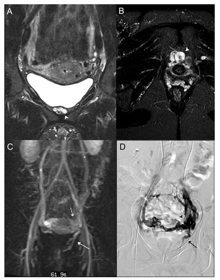 - Coakley, F.V.; Varghese, S.L.; Hricak, H. CT and MRI of Pelvic Varices in Women. J. Comput. Assist. Tomogr. 1999, 23, 429–434. [Google Scholar] [CrossRef]