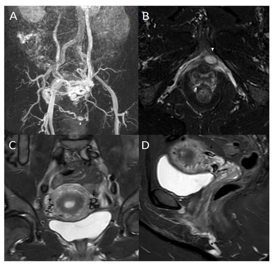 (A) 50-year-old woman who suffered from pelvic pain and vulvar varicosities had magnetic resonance imaging (MRI). Maximal intensity projection (MIP) coronal reconstruction of MRI angiography sequence: Voluminous left periuterine varicose with reflux in the internal pudendal veins (white arrowhead), incompetent left ovarian vein, and vicarious right ovarian vein. (B) MRI axial T2 short inversion time inversion recovery (STIR) sequence: Dilated left internal pudendal vein with aneurysm (white arrowhead). (C) MRI coronal T2 short inversion time inversion recovery (STIR) sequence: Flow voids in dilated pelvic varicose veins (dark arrow). (D) MRI sagittal T2 short inversion time inversion recovery (STIR) sequence: Flow voids in dilated pelvic varicose veins (dark arrow) and dilated left internal pudendal vein (*).