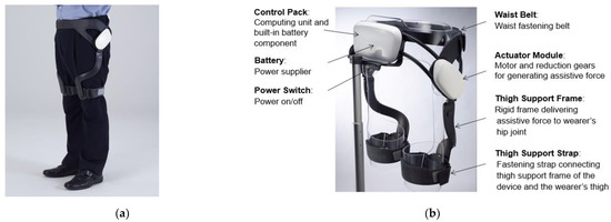 Wearable Hip Exoskeleton, EX1: (a) Exterior of EX1; (b) Description of the exterior.