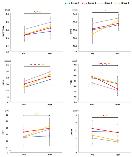 Changes in physical function at the pre and post time points in each group are shown in Figure 2. A significant increase in 10MWT-SSV and TUG test scores was observed in groups B, C, and D (p < 0.05 and p < 0.01, respectively), but not in group A. For the SPPB and FRT, a statistically significant improvement was evident only in group D (p < 0.05 and p < 0.01, respectively). BBS showed significant improvement in all groups (p < 0.01), and GDS-SF scores decreased significantly after exercise with an EX1 in groups B and D (p < 0.05). There were no statistically significant interactions between group and time for physical function.