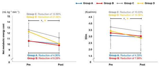 Cardiopulmonary Metabolic Energy Cost. Changes in cardiopulmonary metabolic energy cost at the pre and post time points in groups A, B, C, and D. Group A: overground walking without an EX1, group B: overground walking using the resistance mode of EX1, group C: stair ascent using the assistance mode of EX1, group D: inclined treadmill walking using the assistance mode of EX1. * p < 0.05 compared with pre, paired t-test. EEm, energy expenditure measurement.
