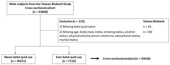On this basis, the data from TWB (2008 to 2019) was used to examine the association between betel nut chewing and KSD in men. A total of 43,848 men were enrolled in the present study as shown in Figure 1. Participants with missing information concerning nut experience (N = 62), age (N = 1), smoking status (N = 9), alcohol status (N = 41), past history of dyslipidemia (N = 11), body mass index (N = 49), physical activity status (N = 16), status of marriage (N = 13), and status of education (N = 10) were excluded, so 43,636 men were entered into the final analysis. All participants signed the informed consent, and all investigations followed the Declaration of Helsinki. The present study was approved by the Institutional Review Board of Kaohsiung Medical University Hospital (KMUHIRB-E(I)-20190398).