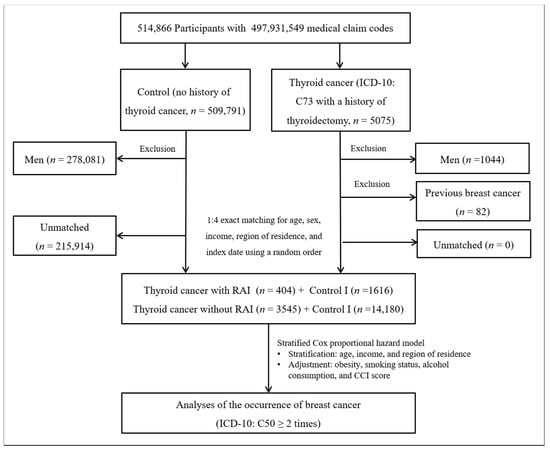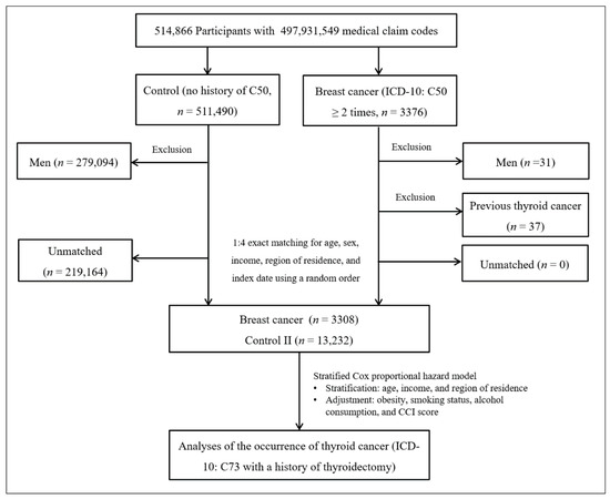 Breast cancer patients were selected from 514,866 participants with 497,931,549 medical claim codes (n = 3376). The control group comprised participants who were never identified as having breast cancer from 2002 to 2013 (n = 511,490). Since most of the breast cancer patients were women, men were excluded from both the breast cancer group (n = 31) and the control group (n = 279,094). Breast cancer patients were 1:4 matched with control participants for age, income, and region of residence. To minimize selection bias, the control participants were selected with a new random number procedure. The index date of each breast cancer patient was set as the time of treatment of breast cancer. The index dates of the control participants were set as the index dates of their matched breast cancer patients. Therefore, each breast cancer patient matched with control participants had the same index date. Breast cancer patients with thyroid cancer before the index date were excluded (n = 37). Control participants with thyroid cancer before the index date were also excluded. Among the control participants, 219,164 were excluded during the matching procedure. Finally, 3308 breast cancer patients were 1:4 matched with 13,232 patients in the control II group (Figure 2).