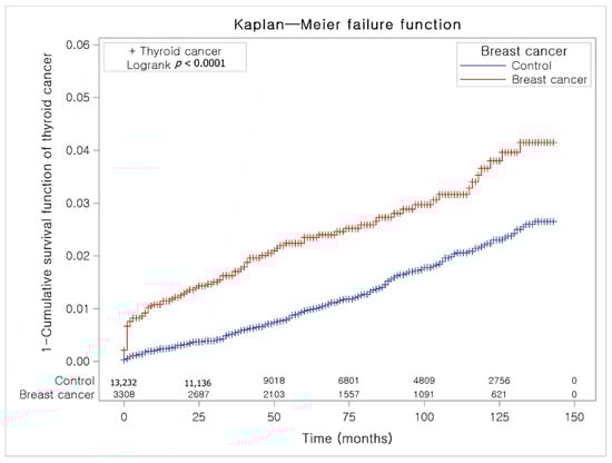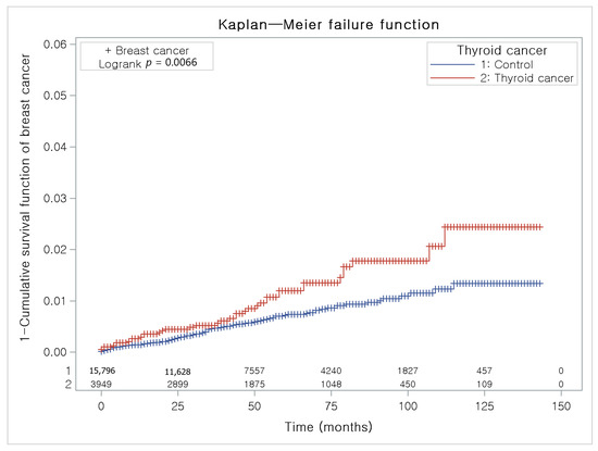 The Kaplan-Meier method and the log-rank test were used to analyze the cumulative incidence rates of breast cancer in thyroid cancer participants and the control I group (Figure 3) and the cumulative incidence rates of thyroid cancer in breast cancer participants and the control II group (Figure 4).