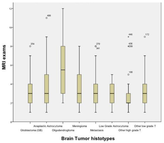 Box plots showing the distribution of the number of MRI exams revised at our nMTB, stratified by brain tumor histotype.