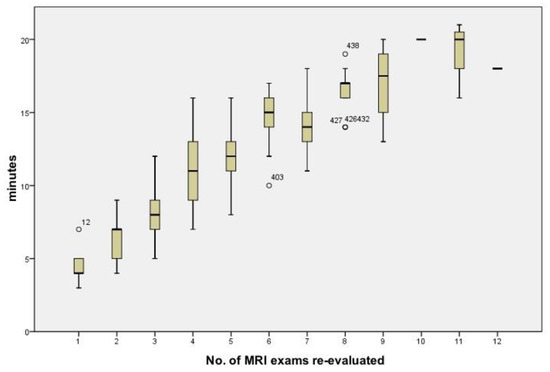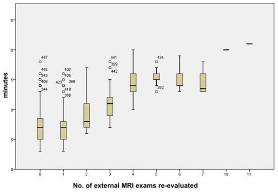 Box plot diagram of the time (minutes) vs. the number of external MRI exams re-evaluated.