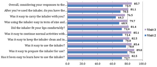 The item with the higher “very” percentage, rating 5 out of 5 on the FSI scale, for both study visits was “Was it easy to prepare the inhaler for use?” (corresponding percentages on Visits 2 and 3: 79.4% and 89.0%). The items with the lower “very” percentages for both study visits were “Was it easy to carry the inhaler with you?” (corresponding percentages on Visits 2 and 3: 64.3% and 76.5%) and “Was using the inhaler easy in term of size and weight?” (corresponding percentages on Visits 2 and 3: 68.9% and 79.7%) (Table 2).