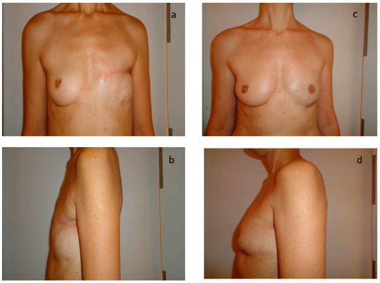 Aesthetic result after breast reconstruction by exclusive lipofilling in patient with B bra size. (a,b) Results after total mastectomy; (c,d) Results after 3 sessions of reconstruction by exclusive lipofilling.