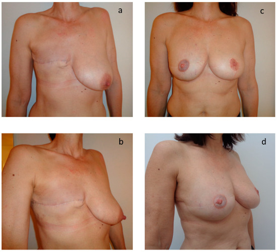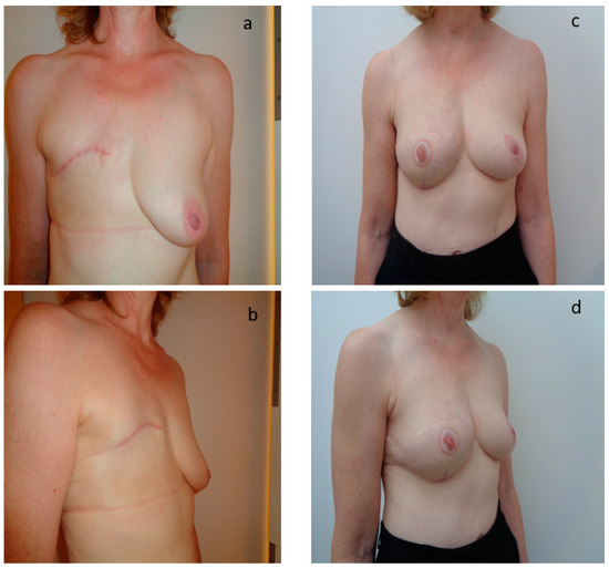 - Longo, B.; Laporta, R.; Sorotos, M.; Pagnoni, M.; Gentilucci, M.; Santanelli di Pompeo, F. Total breast reconstruction using autologous fat grafting following nipple-sparing mastectomy in irradiated and non- irradiated patients. Aesthetic Plast. Surg. 2014, 38, 1101–1108. [Google Scholar] [CrossRef] [PubMed]