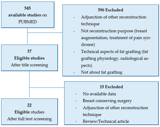 A literature search was performed using the PubMed database. The following search terms were used: (mastectomy) AND (fat graft * OR lipofilling OR fat transfer OR lipotransfer OR fat transplantation OR lipomodelling). Studies found manually or through the reference lists of included studies were also eligible for inclusion. Studies were included if the patients underwent breast reconstruction with fat grafting as the only treatment modality after the surgical resection of the whole breast due to cancer or a genetic predisposition to breast cancer (e.g., BRCA mutation).