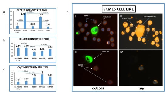 The mean intensity per pixel for all the examined molecules (TUB, GLU and VIM) was evaluated in NSCLC cell lines and patients’ CTCs. It was interesting that there was a great variation regarding TUB and GLU expression not only between cell lines but also among cells in the same cell line. Figure 1d is showing two different SKMES lung cancer cells. The first cell (Figure 1d, I–II) expressed a high level of TUB, however, the second one (Figure 1d, III–IV) was negative for TUB. Interestingly in the TUB positive cells, microtentacles of tubulin participate in the communication between cancer cells and normal peripheral blood mononuclear cells (PBMCs) (blue arrows).