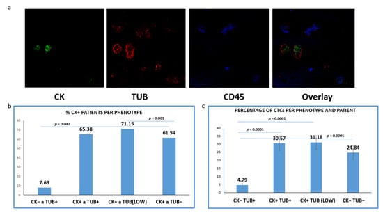 Subsequently, we evaluated the average percentages of CTCs per phenotype and per patient according to our previous studies [20]. This percentage was calculated as the average of the percentages of this phenotype in all CK-positive patients. Among the total isolated CTCs, 30.57% were (CK+/TUB+CD45−), while the rest of the cells appeared with either low (35.97%) or negative (28.66%) tubulin expression (Figure 2c); 4.79% of the total isolated CTCs (only in advanced disease) belonged to (CK−/TUB+CD45−) phenotype and the frequency of these tumor cells was statistically different compared to all the other phenotypes (Figure 2c).