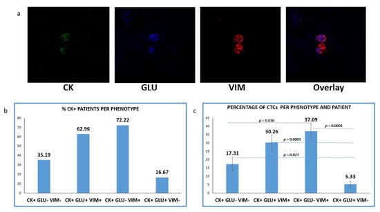 CTCs positive for GLU with a concurrent expression of VIM (CK+/GLU+/VIM+) were observed in 62.96% (34 of 54) of CK-positive patients. Tumor cells with (CK+/GLU+/VIM−) phenotype were detected in 16.67% (9 of 54) of the patients’ samples. CTCs lacking expression of both molecules (CK+/GLU−/VIM−) were detected, in 35.19% (19/54) of the subjects (Figure 4b).